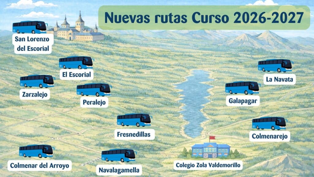 Para el curso 2026-2027, hemos ampliado nuestro servicio de rutas escolares con nuevas incorporaciones para facilitar el acceso al colegio y adaptarnos a las necesidades de nuestras familias. Actualmente, contamos con rutas que recorren Madrid capital y distintas zonas de la Comunidad de Madrid, con paradas desde Atocha (Carabanchel, Alcorcón, Brunete, Boadilla y Villanueva de la Cañada), desde Moncloa (Aravaca, Pozuelo, Majadahonda y Villanueva del Pardillo) y desde Las Rozas (San Lorenzo del Escorial, Collado Villalba y Torrelodones). Como novedad el curso 2026-2027, incorporamos nuevas rutas que amplían la cobertura por la Sierra Noroeste, con paradas en San Lorenzo del Escorial, El Escorial, Zarzalejo, Peralejo, Fresnedillas, Colmenar del Arroyo, Navalagamella, Colmenarejo, Galapagar y La Navata, además de paradas en urbanizaciones de la zona, con un servicio flexible y adaptado a las necesidades de cada familia.